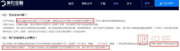 這時(shí)候就要看你的錢是給了國(guó)內(nèi)代理商幫你看管,還是直接給了專用特殊銀行幫你看管。一般底層美國(guó)券商為了防止國(guó)內(nèi)代理商跑路或者經(jīng)營(yíng)不善,都會(huì)采取隔離手段,也就是你通過代理商平臺(tái)購(gòu)買美股的資金會(huì)存放在專用的特殊銀行,當(dāng)代理商違約或破產(chǎn)時(shí),底層券商就可以將用戶的錢返回給用戶 。還是上面兩個(gè)代理商的例子,我們來看下。美豹