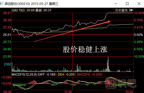 如圖所示,2015年5月27日,森遠(yuǎn)股份(300210)經(jīng)過開盤階段的回落后,股價開始持續(xù)穩(wěn)健地上漲。在上漲的過程中,該股的成交量也持續(xù)放大。這樣的形態(tài)說明隨著股價上漲,越來越多的投資者追高買入股票,推動股價進(jìn)入了良性的上漲循環(huán)中??吹竭@樣的