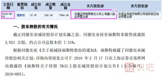 福斯特,6月3日持股5%以上的股東“同德股份”通過大宗交易方式減持了200萬股,接貨方是“華福證券上海遵義路營業(yè)部”。福斯特6月7日因為累積3日漲幅超過了20%上了龍虎榜,來看具體情況。