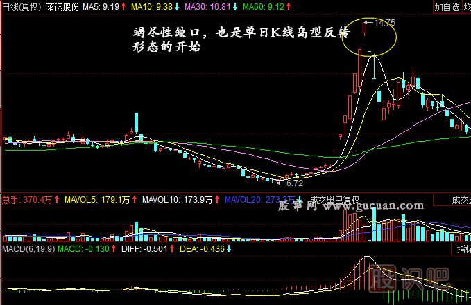 如圖所示:萊鋼股份的日k線中,該股短時間內(nèi)出現(xiàn)在頂部的跳空漲停板即該股的竭盡性缺口所在位置。同時,該股跳空缺口也是單日K線島型反轉(zhuǎn)的開始。投資者最終減倉的時機,當然也就在于此了。后期股價快速跳空下跌后,確定了股價頂部的島型反轉(zhuǎn)形態(tài)。