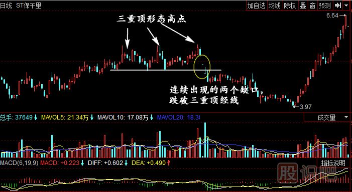 如圖所示:st保千里的日K線中,股價短時間內(nèi)的跳空下跌兩個缺口造就了該股的頂部三重頂被跌破的形態(tài)。投資者減倉出貨的重要時機也正在此處。今后股價持續(xù)回落的過程中,前期的三重頂形態(tài)起到了非常重要的作用。