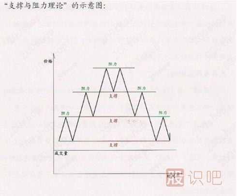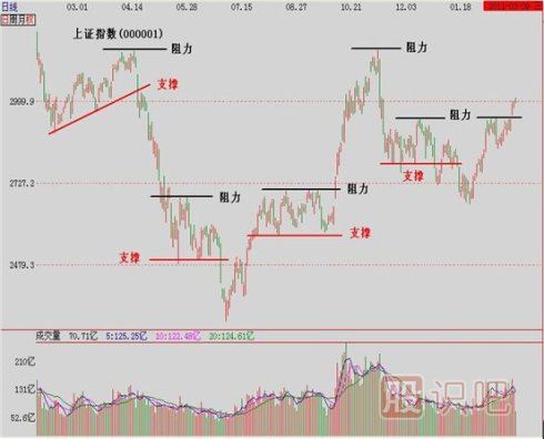 “支撐” 是指在某一價(jià)格區(qū)間內(nèi)有大量的市場需求以使原本下跌的趨勢至少受到阻礙抑或是完全的改變了這種趨勢而形成上升趨勢。同理,“阻力”是指在某一價(jià)格區(qū)間內(nèi)有大量的市場供給以使原本上升的趨勢至少受阻礙抑或是完全的改變了這種趨勢而形成下跌的趨勢。