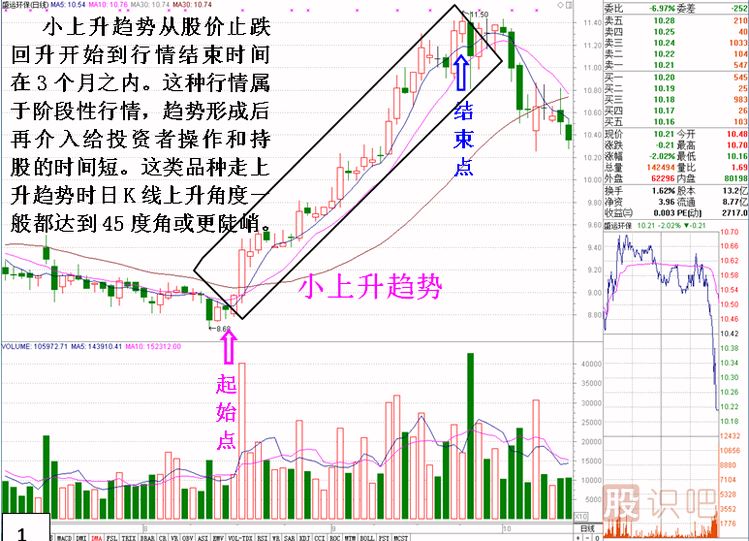 小上升趨勢是指從股價止跌回升開始到行情結束,整個上升趨勢時間持續(xù)在3個月內的。一般上升趨勢指從股價止跌回升開始到行情結束,上升趨勢持續(xù)時間3個月以上至1年之內。超級上升趨勢指整個上升趨勢持續(xù)時間超過1年的。
