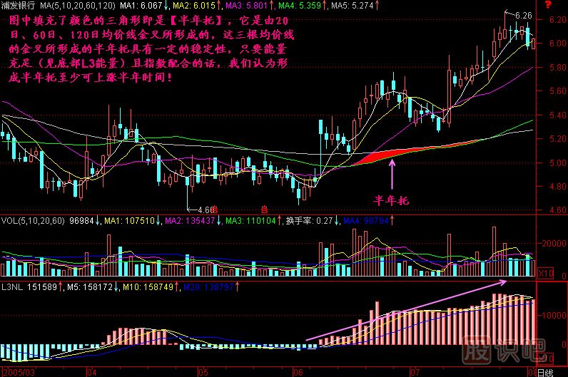 小結(jié):半年托是重要的底部特征之一!你想啊,一只股票只有在形成月價(jià)托、季價(jià)托之后才可能出現(xiàn)半年托,而這一系列的托的形成,要說(shuō)沒(méi)有莊家參與是難以想象的!那么我們還可以通過(guò)L3能量來(lái)檢驗(yàn)是否主動(dòng)性買入量充足,只要是充足的,那就八九不離十了!最后還得研判一下指數(shù)狀況,如果指數(shù)下跌時(shí)間和空間都足夠大了,已經(jīng)構(gòu)筑底部或者已經(jīng)見(jiàn)底回升了,那這樣的時(shí)候出現(xiàn)的半年托,從理論上來(lái)說(shuō),至少應(yīng)該上漲半年!