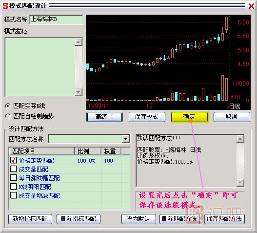 小結(jié):模式選股是選黑馬的利器之一!模式選股的作用,主要是彌補(bǔ)人類(lèi)編輯公式的不足,因?yàn)橛行┨厥獾男螒B(tài)沒(méi)法直接通過(guò)編輯選股公式來(lái)描述,也或者要編輯的話(huà)會(huì)相當(dāng)復(fù)雜,而模式選股這個(gè)功能就是彌補(bǔ)這項(xiàng)缺點(diǎn)的,你如果有什么好的想法沒(méi)法通過(guò)編輯公式實(shí)現(xiàn)的,都可以運(yùn)用模式選股來(lái)完成。