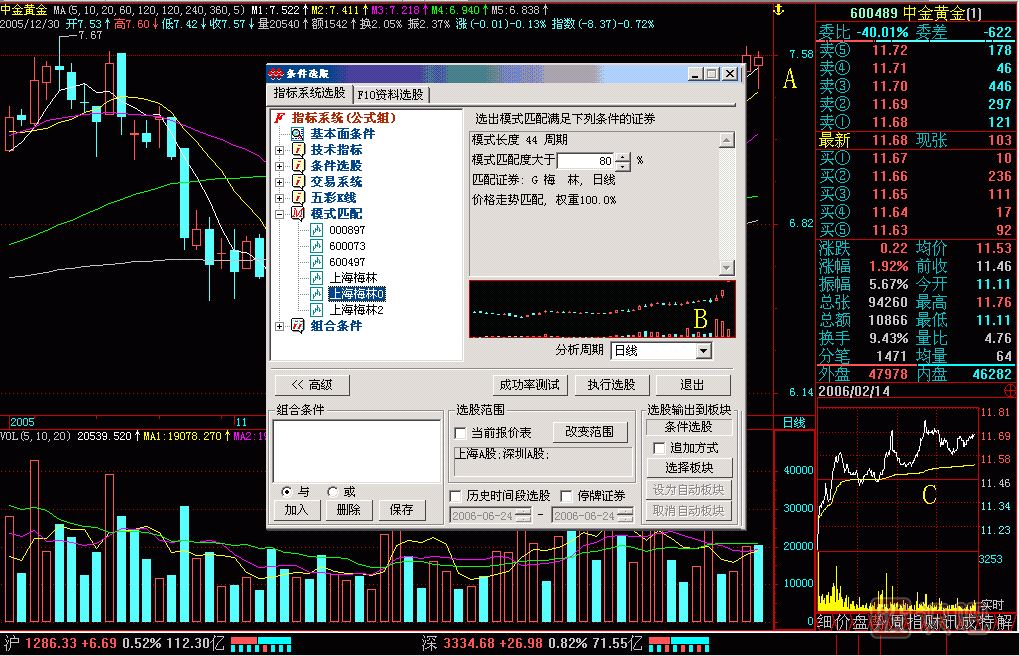 目前,計(jì)算機(jī)已經(jīng)能智能編制選股條件,它比人工編制選股條件更客觀、更快捷。如(圖237-1)的上海梅林曾經(jīng)是翻幾番的大黑馬,它啟動(dòng)前的形態(tài)是A區(qū)間。用鼠標(biāo)框定A區(qū)間,計(jì)算機(jī)就對(duì)其中的K線(xiàn)排列、均線(xiàn)排列、量柱狀體排列和量均線(xiàn)排列作記憶。然后你指定模式匹配度大于多少%,如果要100%匹配度,要求計(jì)算機(jī)選出與選股條件100%一樣的個(gè)股,那么,除了模式本身是100%符合外,幾乎不可能再找到第二個(gè)。所以,匹配度必須選擇在99%以下,實(shí)踐中以90%至80%的匹配度為宜。本圖選擇80%匹配度,就是八成相似的形態(tài)就選出來(lái)。A區(qū)間具體形態(tài),被計(jì)算機(jī)抽象成上海梅林B形態(tài),然后就去按圖索驥。