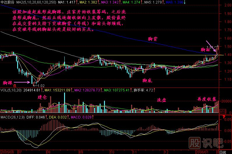 完整的赤腳圖形實(shí)際上是莊家完整的建倉過程。由于這種圖形往往是莊股啟動前的征兆,被股民戲稱赤腳大仙。遇到赤腳大仙時,買入太早了,怕赤腳大仙再睡一大覺;買入太晚了,又怕赤腳大仙飛奔。合適的買入位置,在股價放量沖過年線至前頭部E點(diǎn)之間。