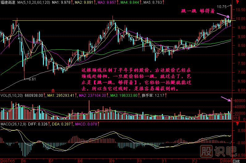 (1)在圖中3.74元的收盤價(jià)高點(diǎn)作水平線A,就得到頸線。今日k線跳起來(lái),夠得著頸線,這時(shí)如果放量,就有可能沖過(guò)頸線,開(kāi)拓頸線上方的空間。如果今日K線比A線低得多,如一個(gè)漲停板也夠不著頸線,那就沒(méi)戲。假如跳一跳,夠不著,又不放量,那就更沒(méi)戲了。運(yùn)氣好時(shí),還能慢慢漲,運(yùn)氣不好時(shí),沒(méi)完沒(méi)了地跌,總之,不會(huì)發(fā)動(dòng)大行情的。一個(gè)快速盈利的短線高手,眼球只盯著跳一跳夠得著的個(gè)股。