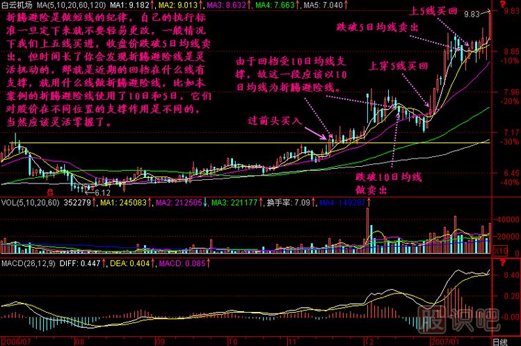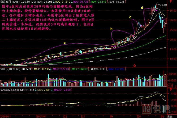 一般情況下,對(duì)于技術(shù)生疏的朋友,可以使用類(lèi)似我們前面曾講過(guò)的6字買(mǎi)賣(mài)法來(lái)死板的操作,而對(duì)于技術(shù)稍好的朋友,也許可以靈活掌握。比如在上漲初期,由于莊家建倉(cāng)洗盤(pán)的需要,股價(jià)振幅會(huì)稍大,這個(gè)時(shí)候使用20日均線來(lái)折騰避險(xiǎn)就顯得穩(wěn)定些,避免了頻繁的進(jìn)出,這個(gè)時(shí)候股價(jià)往往是第一或者第二上漲速度,而隨著行情的繼續(xù),股價(jià)突破上升通道壓力線加速上漲的時(shí)候,就要及時(shí)把折騰避險(xiǎn)線調(diào)整為10日、甚至5日均線了,因?yàn)楣蓛r(jià)進(jìn)入加速上漲之后,一旦下跌跌破5日均線,有可能造成獲利盤(pán)蜂擁而出,如果莊家也乘機(jī)出貨,而你不及時(shí)在股價(jià)跌破5日均線處賣(mài)出的話,就被動(dòng)了,這個(gè)時(shí)候使用20日均線來(lái)避險(xiǎn)顯然就不對(duì)了,而使用5日均線可大大提高靈敏度。