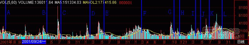 第二步實驗,把以上成交量柱體圖上方的相對應的K線圖掛出來,看看“黑洞”拉出來的“天線”指向K線的頭部還是底部?還是其它部位?觀察“黑洞”是否“吞噬”一切靠近它的“能量”?做多力量被“吞噬”后,股價能不能上升了?可怕的股價頭部是不是形成了?每一個“黑洞”是不是對應每一個股價頭部?