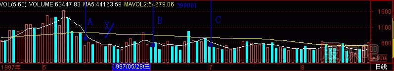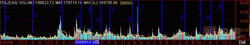 也許會有人問,“黑洞”對深成指頭部預測效果如何?請看,(圖291-13) 對應(圖291-5)深圳成指日K線的全圖。(圖291-13)的成交量柱體圖上有A、B、C三個“黑洞”,那時,我們還不知道這成交量柱體圖是哪個股票的,現(xiàn)在明白了,是深成指的。天線A、B、C對應的日K線圖,是:A天線對應5日、10日價均線死亡交叉1,B天線對應5日、10日價均線死亡交叉2,
