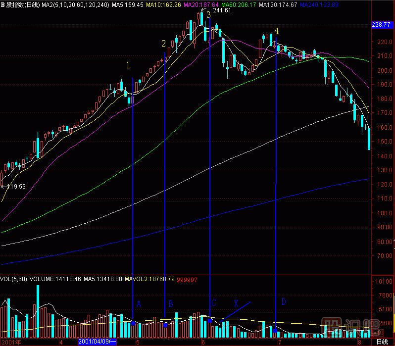 再到上海B股指數(shù)上作試驗,(圖291-15)成交量柱體圖上有A、B、C、D四個“黑洞”,各自拉起一根天線,對應1、2、3、4個K線位置,正好是上海B股指數(shù)日K線的241點頭部區(qū)間,在這里清倉是何等快樂呀!