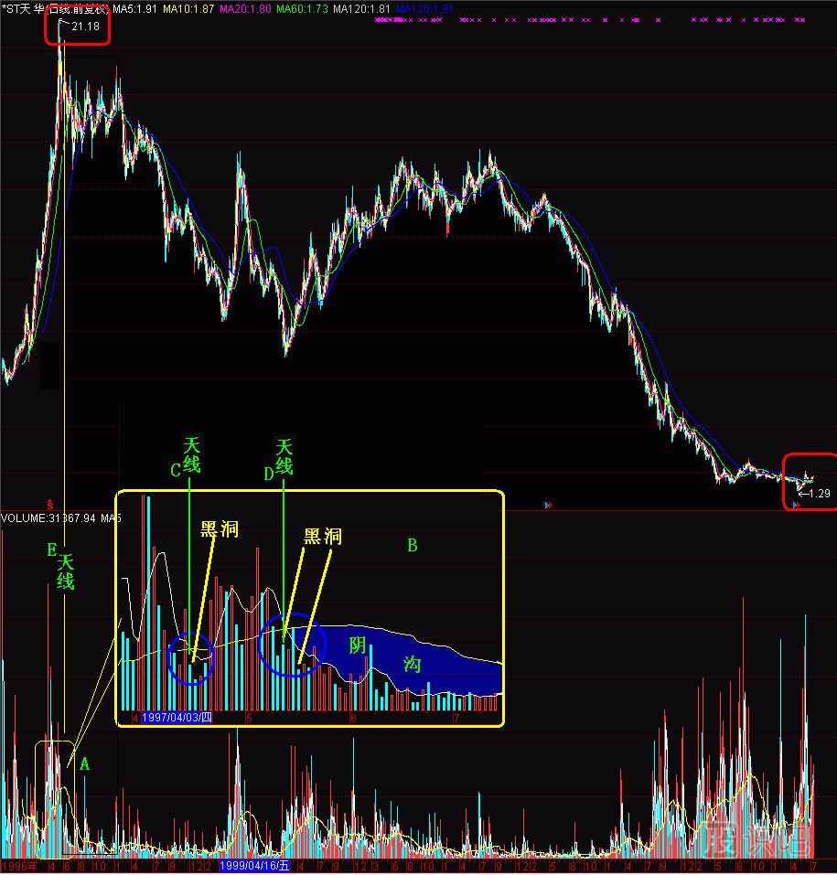 (圖291-2)中,B方框是放大了的A方框,C天線和D天線由于相隔距離很小,在A方框中,合并成E天線了。沿著E天線向上,是21.18元的天價區(qū)。E天線附近巨大的成交量無法推動股價繼續(xù)上升,反而出現(xiàn)“黑洞”,這是明顯的出貨信號。“黑洞”以后有“陰溝”,它是5日、60日量均線的“冷空氣帶”,為了便于分別,在量均線上叫“陰溝”。“大江大河不翻船,翻船翻在陰溝里”,許多股民就是見了“陰溝”往里鉆,結果翻了船。由于“陰溝”圖形是跟著“黑洞”的,因此,統(tǒng)稱“黑洞陰溝”,都不是好聽的名詞,也不是炒股的好地方,在這里炒股的人不是被“黑洞”吞噬,就是在“陰溝”翻船,難有逃脫的。