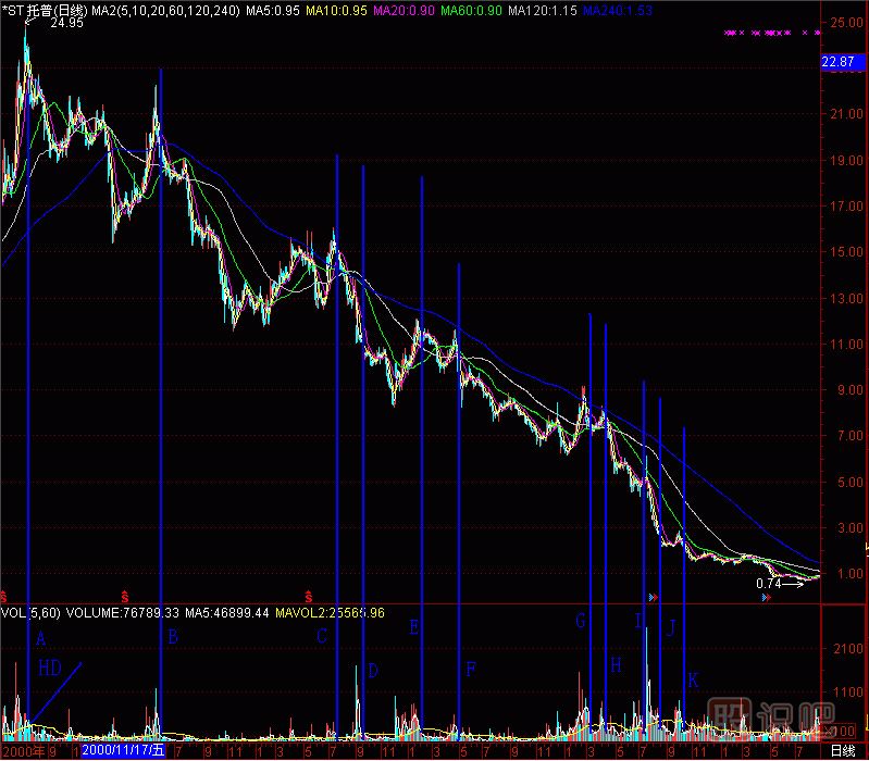 再找個股做試驗,(圖291-17) *ST托普000583的成交量柱體圖上有A至K共11個黑洞,拉起11根天線,對應了11個頭部。也就是說,在24元處沒逃走的話,以后“黑洞”又給你10次逃跑機會,只要逃,就不會遭受跌到0.74元的悲慘下場。