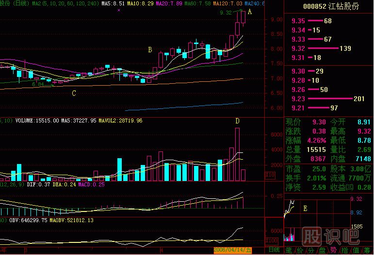 江鉆一把鉆,現(xiàn)在講沖擊鉆。(圖256-1)A處四根K線陽(yáng)線像不像沖擊鉆?B處是沖擊鉆把手,有個(gè)高點(diǎn)十字星K線,是電扳扣,那么A就是鉆頭了。沖擊鉆頂緊天花板是什么感覺(jué)呢?是向上沖擊,在堅(jiān)硬的天花板上打個(gè)洞出來(lái),是何等的穿透力量!E處是沖擊中的顫動(dòng),上面好像有阻力,分時(shí)走勢(shì)開(kāi)始橫走,這是很正常的,有時(shí)打了幾十分鐘,鉆頭分寸不進(jìn),突然,鉆頭撲空而進(jìn),甚至穿墻而過(guò),這就叫突破。鉆頭在突破時(shí),沖擊鉆的鉆體是不會(huì)穿墻而過(guò)的。股價(jià)在突破時(shí),千軍萬(wàn)馬一躍而過(guò),除非漲停板限制它前進(jìn),否則不撞南墻不回頭?,F(xiàn)在A處的K線形態(tài),一旦向上突破,很可能連續(xù)出現(xiàn)幾個(gè)漲停板,抓住沖擊鉆,就抓住了暴漲前的個(gè)股,而且這種形態(tài)出現(xiàn)的頻率較高,每月有十幾次這樣的機(jī)會(huì)。