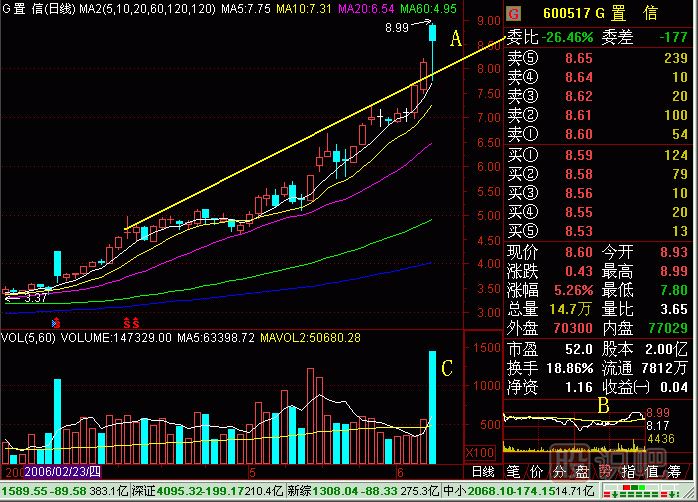 從日K線圖上看(圖281-2),G置信昨天越過高點連線,有加速上升的跡象。只是因為成交量不充足,可理解為躍躍欲試狀態(tài)。今天跳空高開在8.93元,離漲停板8.99元僅0.06元之差。原以為可瞬間一步漲停,沒料到當(dāng)天上證指數(shù)大暴跌。這樣的莊家,在錯誤的時機發(fā)動攻勢,也有點難以置信。不過,從昨天躍躍欲試的隱蔽性動作,到今天跳空高開的爆發(fā)性突破高點連線,這些動作一氣呵成,也順理成章。圖中的A點,長長的下影線成了反壓高點連線,也是標(biāo)準(zhǔn)的廣通技術(shù)。C處的巨量是“頂天立地量”,是多空大搏殺的結(jié)果。成交量柱體圖是白色陰量,這是因為收盤價低于開盤價,被認為是陰量。但有的軟件規(guī)定,今日收盤價高于昨日收盤價,皆作為紅色陽量。我們深知這是“引體向上”形態(tài),其多空形勢就一目了然,無所謂成交量柱體圖的白色紅色了。