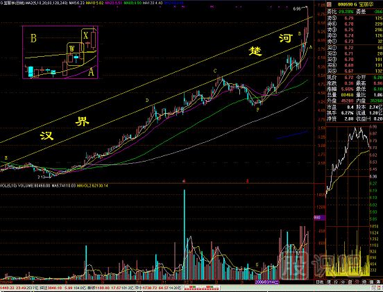 怎么殺過去呢?這里采用“雙炮過河”的形態(tài)。將A、B區(qū)間放大后,放在左上角?,F(xiàn)在我們看清楚了,多方在楚河線下先作“兩陽夾一陰”“多方炮”圖形,見W處,攻擊前充分盤整,然后一炮過楚河,又是“多方炮”形態(tài),見X處。在這里用“兩陽夾一陽”,比“兩陽夾一陰”稍強勢。兩個“兩陽夾一陰”應(yīng)該是六根K線,這里是五根K線,原因是中間共用一根長陽線,形成“三陽夾兩陰”這種組合“多方炮”,進攻速度加快。一旦多方越過楚河,就在河對面大開殺戒,不沖殺一程是不肯收兵的。研究過楚河的各種形態(tài),就是為了把握住過楚河的時機,在這里買進股票,風(fēng)險小,收益大。