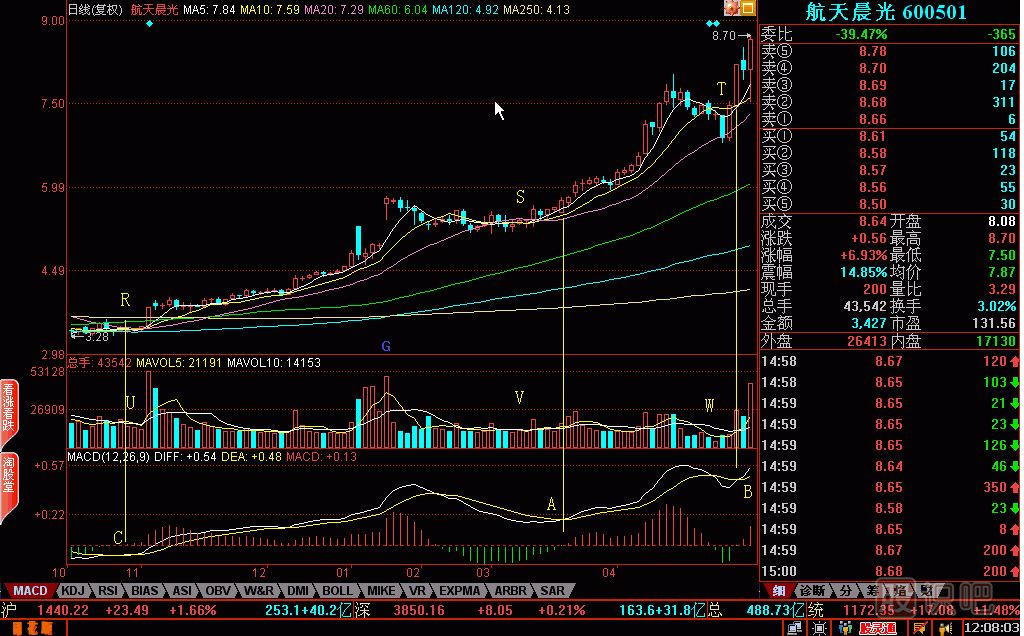 MACD零下做空,零上做多,零上紅金叉堅(jiān)決做多,二次零上紅金叉更堅(jiān)決做多,這是廣通紀(jì)律。R點(diǎn)后,股價(jià)進(jìn)入2+3區(qū)間,MACD進(jìn)入零上紅區(qū)間,這時(shí)可以買(mǎi)股票了。然而,像 600051航天晨光這樣的個(gè)股,買(mǎi)進(jìn)后,漲得很慢;S點(diǎn)后,MACD出現(xiàn)第一個(gè)零上紅金叉,就是零上紅區(qū)間第一個(gè)金叉的意思;然后股價(jià)上升速度加快,持股時(shí)間不長(zhǎng),漲得不少。由此可見(jiàn),買(mǎi)股票買(mǎi)在零上紅金叉是劃得來(lái)的買(mǎi)賣(mài)。B點(diǎn)出現(xiàn)第二個(gè)零上紅金叉,這是更好的買(mǎi)入點(diǎn),一旦股價(jià)創(chuàng)新高,就又有一段漲勢(shì)。特別要注意把握的關(guān)鍵技術(shù)細(xì)節(jié)是,B點(diǎn)要比A點(diǎn)的位置高,T點(diǎn)要比S點(diǎn)的股價(jià)高,否則就是MACD背離,未來(lái)漲勢(shì)大打折扣。