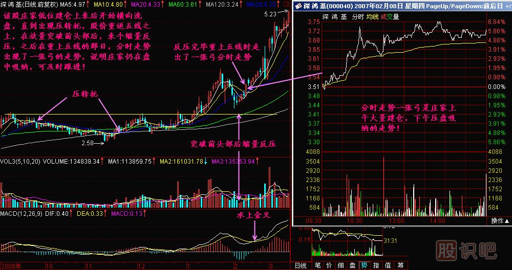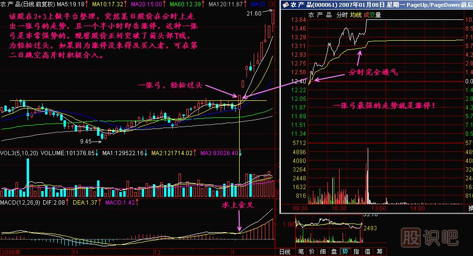 一張弓最強的走勢是下午就漲停了,這樣的一張弓如果正好突破重要壓力線的,即便當天沒法再買進,第二天跳空高開只要回檔不深,還是可以買進的,因為莊家才啟動行情,目標還遠。