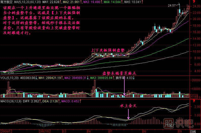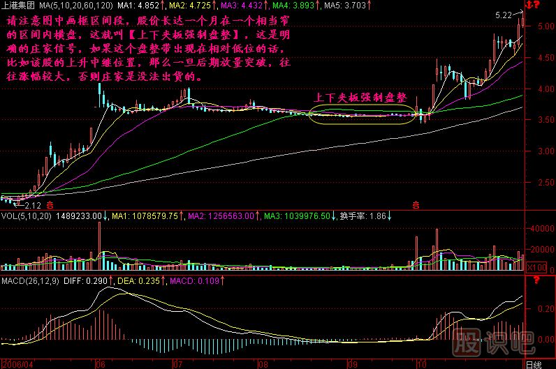 小結(jié):在現(xiàn)階段,我們的股市還很年輕,既然年輕,就避免不了莊家主力對股價的操控行為,如果你發(fā)現(xiàn)一只股票在相對低位出現(xiàn)上下夾板強制盤整的走勢,一般是操盤手受到某種指令的操控這樣做的,這就說明這個股票里面有莊家,那么一旦股價在后期向上突破,則是一個參與的機會。當(dāng)然這要剔除那些已經(jīng)漲幅巨大、進入高空飛行的股票,那樣的股票在高位走的是出貨拉鏈,和本節(jié)的內(nèi)容是不同的,性質(zhì)不一樣。