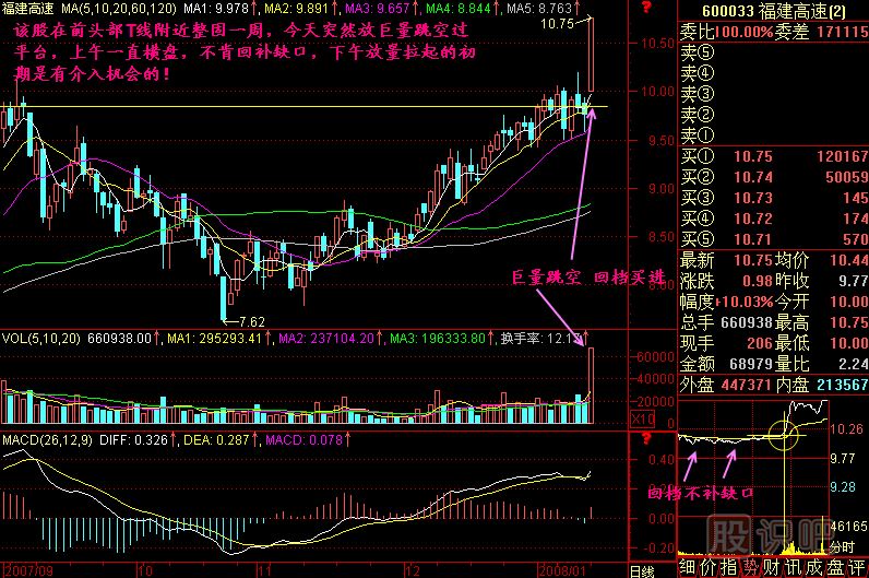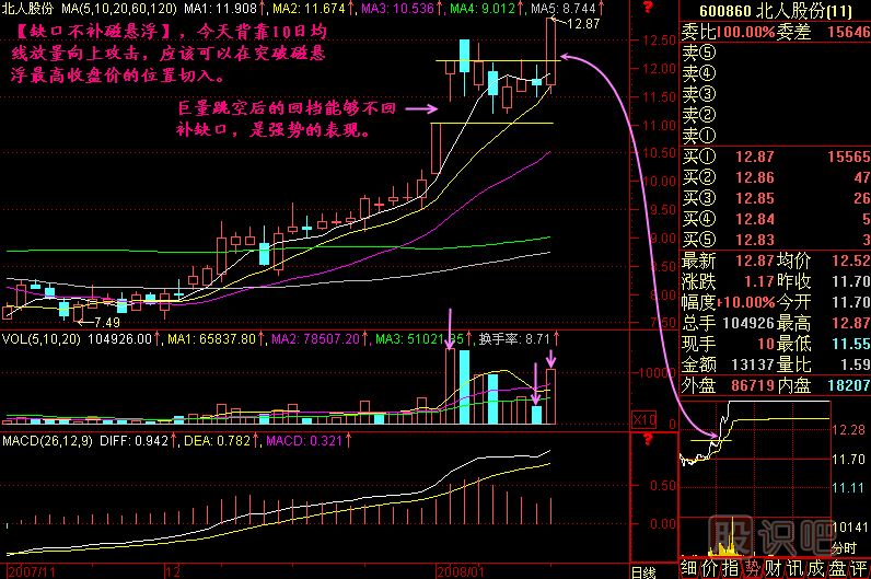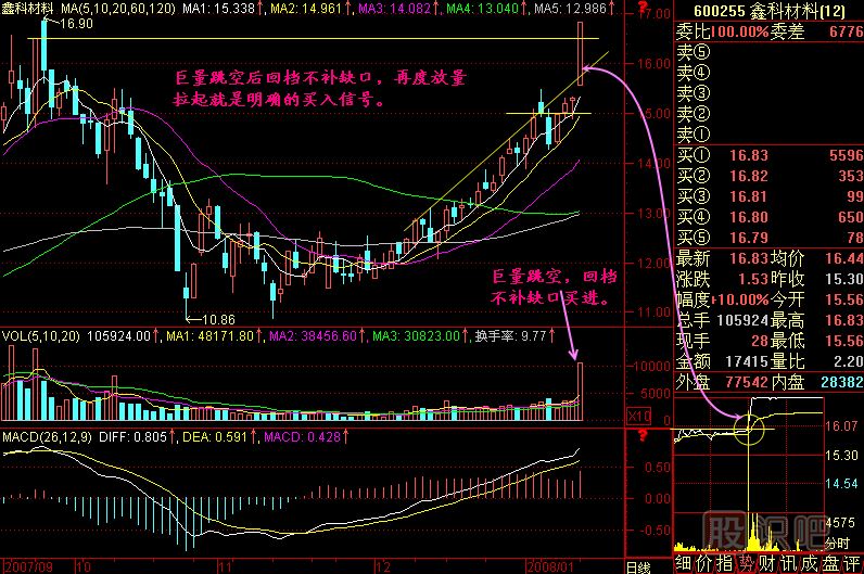 因此小平臺(tái)向上突破給我們最大的安慰就是跌下來還是老地方,而且也不太可能跌下來,像這只股票,放出巨大的成交量,量比達(dá)到18,用這種速度往上攻擊的話,漲勢還要好。如果運(yùn)氣好,當(dāng)天就可以漲停板,因?yàn)樗瞎舻?a href=http://www.123cyq.com/GPRM/sy/1399.html target=_blank class=infotextkey>空間還是有的嘛,往下回檔的空間沒有。