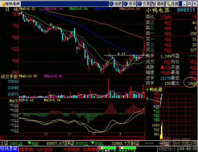 今天開盤股價(jià)跳空高開,放出巨量,15分鐘就放出巨量來了,達(dá)到平時(shí)一天的成交量,實(shí)際上我們只要七八分鐘就可以發(fā)現(xiàn)它,就容易在a點(diǎn)快速切入,很多同學(xué)已經(jīng)很有經(jīng)驗(yàn)了。開盤——放量——快速切入,這個(gè)動(dòng)作一定要做的熟練,要反復(fù)訓(xùn)練。a點(diǎn)切入實(shí)際價(jià)位在6.37元,已經(jīng)漲了2%左右,但這不要緊,因?yàn)樾羞M(jìn)中的東西是最可信的,它畢竟是在一個(gè)小平臺(tái)上向上攻擊,你怕什么?它跌下來也不就跌到老地方嗎?