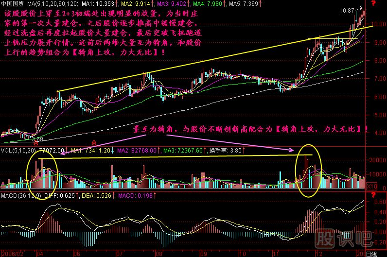 這就是犄角上攻,力大無(wú)比,這里的“犄角”主要指的是“量”,但這個(gè)“量”還必須得有“價(jià)”的配合,就是說(shuō),這個(gè)“量互為犄角”必須運(yùn)用在能底部抬高,不斷創(chuàng)新高,頂緊右上角的股票上,而不能把它運(yùn)用在“頂緊右下角”的股票上,這點(diǎn)不要亂用啊。