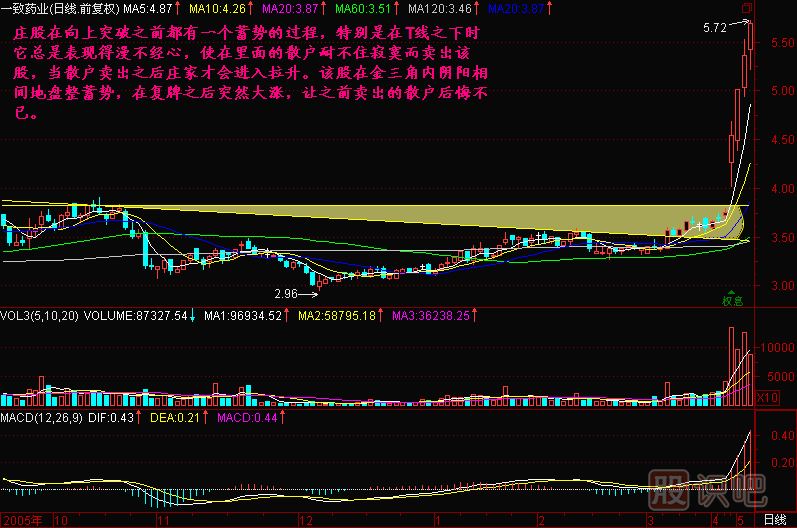 一般情況下股價在抵達T線或者高點連線壓力線附近時,總是表現(xiàn)出要沖高回落的樣子,但是股價并不大幅下跌,而是吸附在壓力線附近,隨著散戶的拋出逐漸接近尾聲,成交量萎縮下來了,這就快要達到莊家的目的了,這時候只要股價放量突破壓力線,就是啟動的時候,使散戶想追也追不上了。