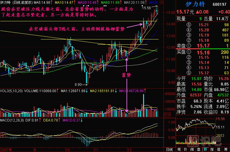 那么現(xiàn)在我要說第三個問題,我們要等待什么時候介入?股價現(xiàn)在是躲在這個地方,放了量以后要洗盤,洗盤要洗到什么程度?洗到量充分地萎縮。今天的量比只有0.56了,已經(jīng)相當萎縮了,也就是說這一次洗盤已經(jīng)洗不出多少人來了,或者說散戶手里沒有什么籌碼了。這樣洗了三天,還是洗不出多少籌碼來,只要洗不出籌碼,沒有浮動籌碼了,莊家的目的就達到了。莊家不是不想漲,他也是天天想漲,但是有人跟在里面他就不放心,他就要把盤子洗干凈。因此,當量比極度小的時候,最小量的時候就應(yīng)該介入了,向上爆發(fā)是隨時的事情。你不要看它現(xiàn)在不漲,它這是在蓄勢,是暴漲以前的一個蓄勢。我們可以這么比喻,把拳頭抽回來,是為了更有力地打出去,股價暴漲前的蓄勢就是這樣的。因此,現(xiàn)在不但不是賣出的時候,而是要買進的時候,買就要沿著H線買。