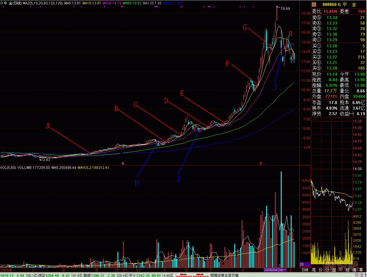 茶壺圖276-1(圖276-1)E點(diǎn)是股改缺口,當(dāng)天換手16.95%,漲16.36%,明顯有資金介入,以后連續(xù)放量,股價(jià)溫和爬高,這也是收集籌碼的跡象。G點(diǎn)是洗...