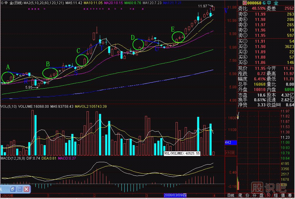 重上五線金不換圖242-1今天教一招:重上五線金不換。(圖242-1)的A點(diǎn)處是日K線重新回到五線之上(5、10、20、60、120日價(jià)格平均線),這是買入機(jī)會(huì)。...