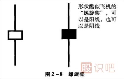 螺旋槳":K線的中間實體很小,上下影線很長,看上去就像飛機的螺旋槳,故得名。
