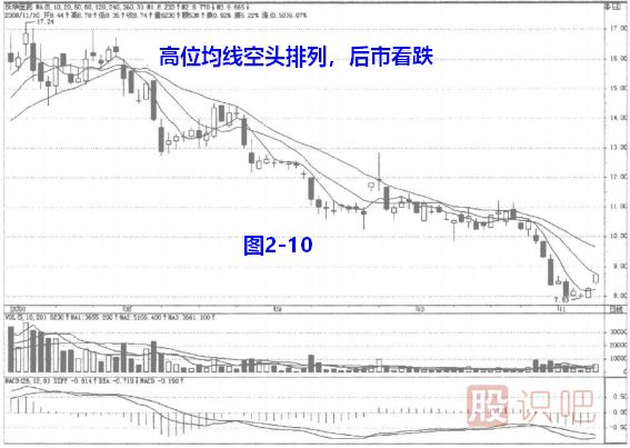 空頭排列指的是日線在下,以上依次分別為短期線、中期線、長期線,這說明我們過去買進的成本都比現(xiàn)在高,做短、中、長線的此時拋出都在“割肉”,市場一片看壞。顯然,這是典型的熊市。