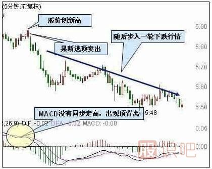 3、5分鐘MACD頂背離。股價創(chuàng)新高時,MACD沒有創(chuàng)新高,MACD出現(xiàn)頂背離: