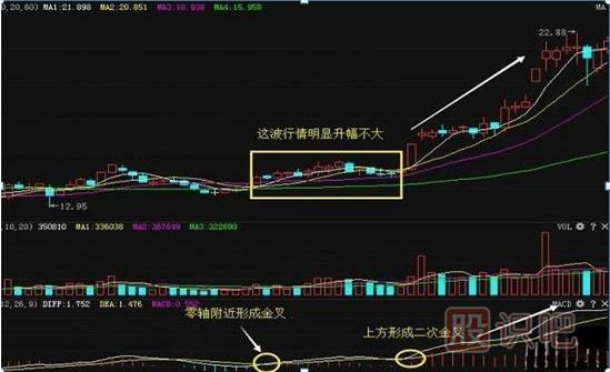 MACD在零軸上方金叉后的走勢有兩種情況要注意:前一波上升行情升幅不大、力度不強時,MACD在零軸上方金叉后,后面的上升行情會比前一波上升行情升幅大,力度也要強。此方法能捕捉到了一波快速強勁上升的大行情。