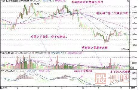當(dāng)5日、10日和20日內(nèi)買進(jìn)股票的平均成本越來越接近時(shí),人們發(fā)現(xiàn)早買或遲買股票一樣都無可盈利,購買股票的迫切性降低。而市場(chǎng)另一方面賣出方已明顯感到購買力降低,愿意用更低的價(jià)格出售股票。于是有一天賣出方突然用低于三條均線的價(jià)格大量賣出,當(dāng)日收盤價(jià)跌破三條均線,形成“斷頭鍘刀”。5日、10日和20日內(nèi)買進(jìn)股票的人突然發(fā)現(xiàn)已被套牢,先知先覺者在第二天行情中愿意用比“斷頭鍘刀”這根陰線收盤價(jià)更低的價(jià)格沽出,于是發(fā)生空殺空行情。此時(shí)股票供應(yīng)量急驟增加,而股票需求量急驟減少,終于誘發(fā)一輪跌勢(shì)。