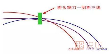 圖形特征:當(dāng)股價(jià)在高位盤整后漸漸下滑,此時(shí)5日、10日和20日均線形成的均線系統(tǒng)呈現(xiàn)收斂狀態(tài)。此時(shí)如出現(xiàn)一根陰線跌破三條均線形成一陰斷三線的“斷頭鍘刀”,則應(yīng)警惕有一輪跌勢(shì)。特別是帶有較大成交量的陰線,則更有下跌的可能。