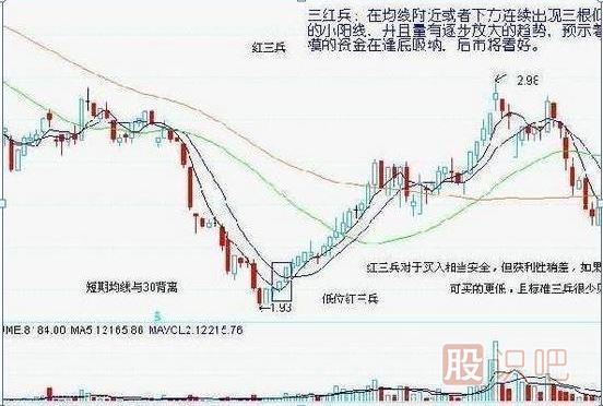 在均線附近或者下方連續(xù)出現(xiàn)三根低開高收的小陽線,并且量有逐步放大的趨勢,預(yù)示著有小規(guī)模的資金在逢底吸納,后市將看好。