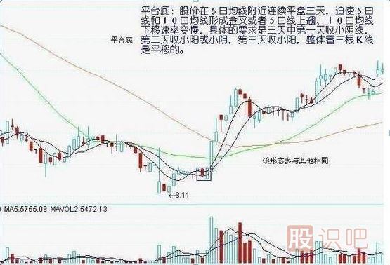 股價(jià)在5曰均線附近連續(xù)平盤三天,迫使5曰線和10曰均線形成金叉或者5曰線上翹、10曰均線下移速率變慢,具體的要求是三天中第一天收小陰線,第二天收小陽或小陰,第三天收小陽,整體看三根K線是平移的。