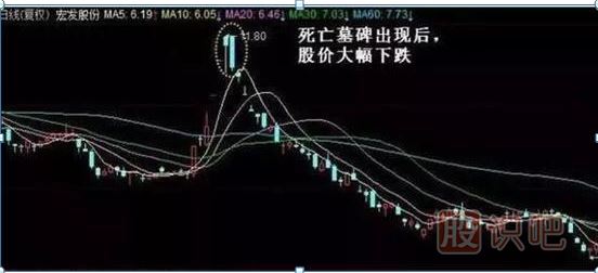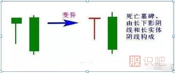 1、死亡墓碑K線組合由錘頭線和陰線組成,陰線為中陰線或大陰線。