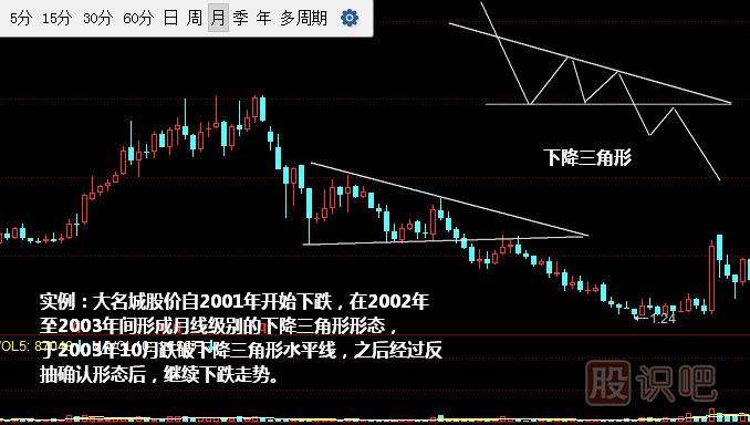 下降三角形形態(tài)K線圖圖解實(shí)例:大名城股價(jià)自2001年開始下跌,在2002年至2003...