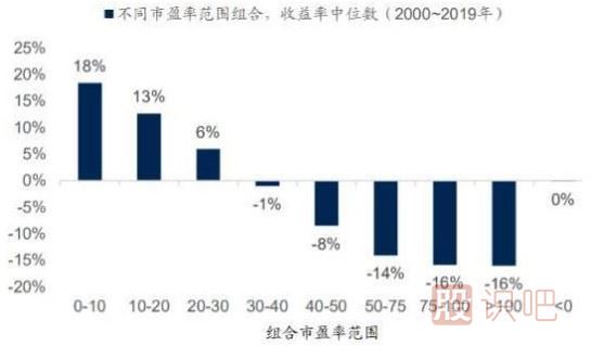 市盈率0到10倍的為一組,10到20倍的為一組,20到30倍的為一組,30到40倍的為一組,40到50倍的為一組,50到75倍的為一組,1000倍以上的為一組,市盈率為負(虧損)的單獨為一組。然后計算t+1年該組合中股票的年收益率,每年滾動換一次樣本,時間范圍是2000年至2019年。