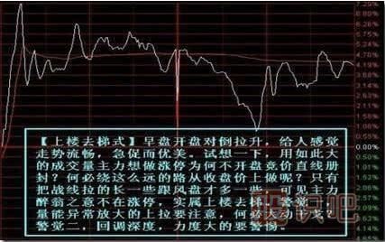 圖例三:【上樓去梯式】此種形態(tài)盤中較為常見,出現(xiàn)在主力短線高拋低吸走勢中較多,短期有一定風(fēng)險(xiǎn),如成交量和換手率沒有成倍放大,對大勢運(yùn)行并無太大影響。只是在個(gè)股走出如此形態(tài)的時(shí)候介入需小心短期風(fēng)險(xiǎn),持有需醒悟獲利了結(jié)。