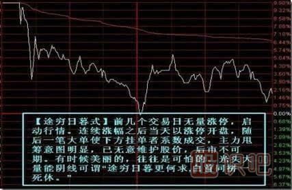 圖例四:【途窮日暮式】此種形態(tài)對于盤感不佳或者手法遲鈍的投資者有一定殺傷力,稍微遲疑帳戶縮水明顯;對于觀望者沒有多大影響,如此大幅下挫誰還能跟進(jìn)?對于持有籌碼投資者可在早盤開盤填好單子以備不時(shí)之需。養(yǎng)成習(xí)慣。