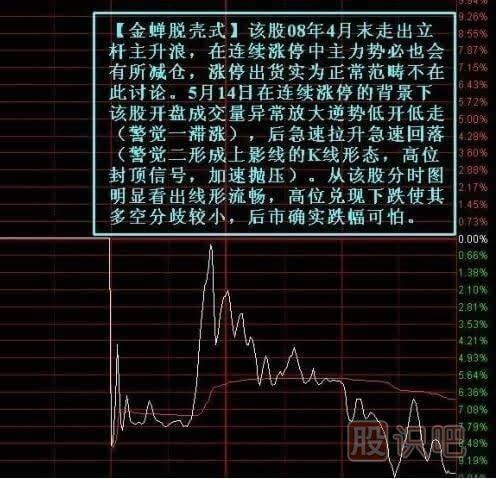 圖例二:【金蟬脫殼式】該形態(tài)大多出現(xiàn)股價(jià)直線上漲之后,所以基本在此之前很多投資者要么被洗出局,要么止盈離場,所以基本無太大殺傷力。只是知道在大漲之后離大跌就不遠(yuǎn)了,所以連續(xù)漲停個(gè)股進(jìn)入有風(fēng)險(xiǎn),追漲需謹(jǐn)慎。一旦一時(shí)心血來潮進(jìn)入,走出如此形態(tài)即需回避離場。判斷一只個(gè)股是否脫殼其實(shí)成交量已經(jīng)不大管用,這種短期爆炒個(gè)股均放大成交量主要可觀察分時(shí)中回調(diào)的力度和空間,不能一概而論。