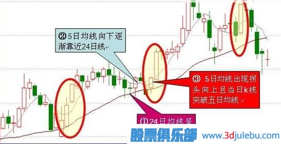 ③ 5日均線出現(xiàn)拐頭向上且當(dāng)日k線突破五日均線