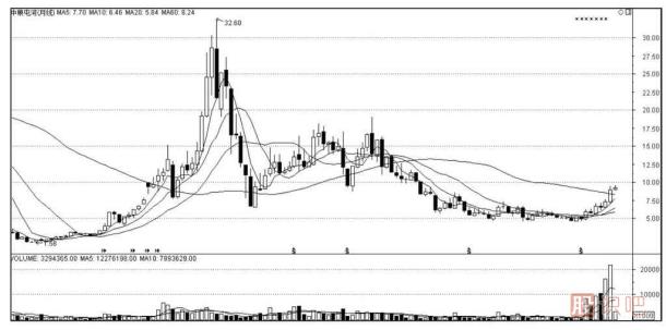 月K線可以用來判斷長期下跌的股票。例如,在某股月K 線圖上如果出現(xiàn)一根“十字星”和上影線很長的“射擊之星”或“倒錘頭”,而這根“倒錘頭”K線又是在大漲之后出現(xiàn)的,則預(yù)示著該股在今后很長一段時(shí)間內(nèi)將陰跌不止,途中偶有反彈后也會(huì)繼續(xù)下跌,直到大行情發(fā)動(dòng)前的起步位置。