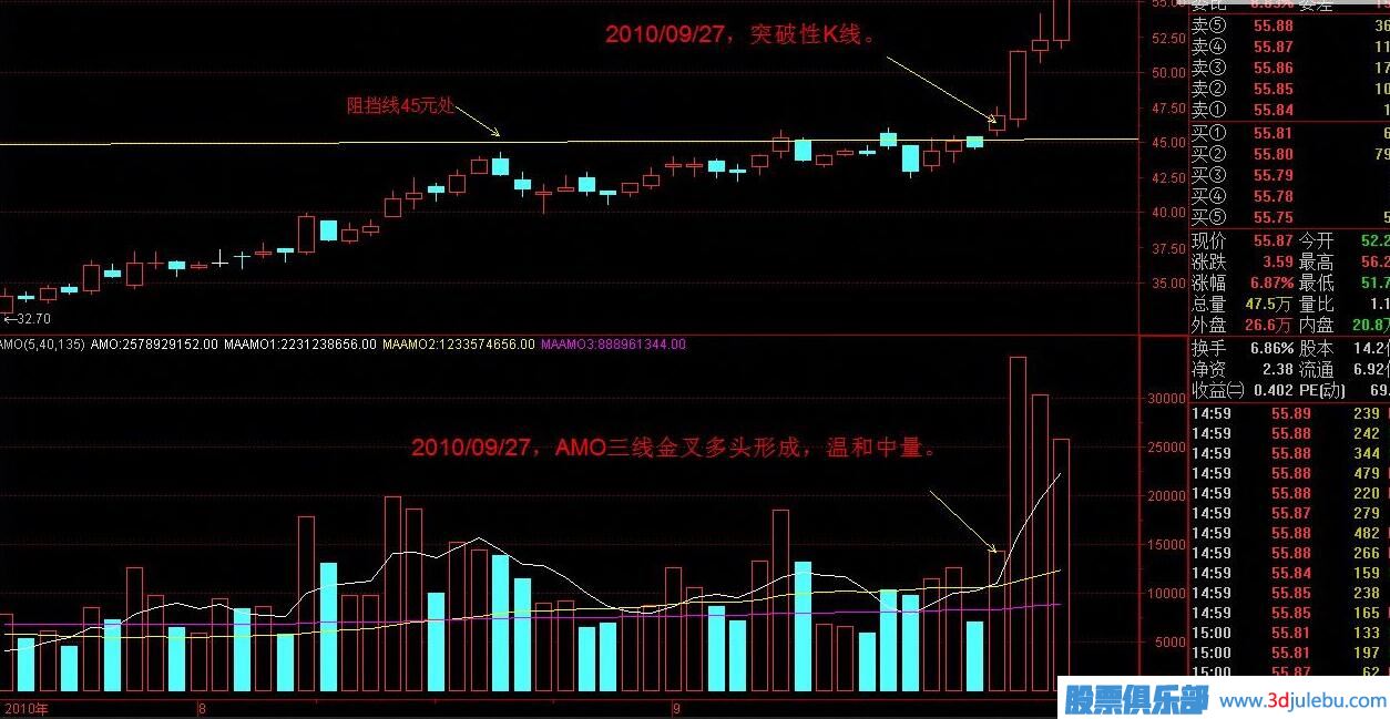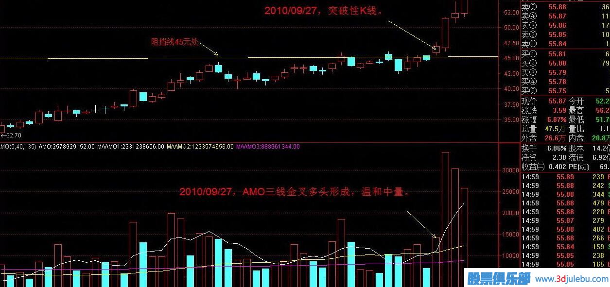 實例解析 600547,山東黃金。 2010/09/27,這天是滿足條件的標(biāo)準(zhǔn)的突破日,量AMO和價K,發(fā)生突破共振,操盤如此完美,可見主力不凡。阻擋線在45處。