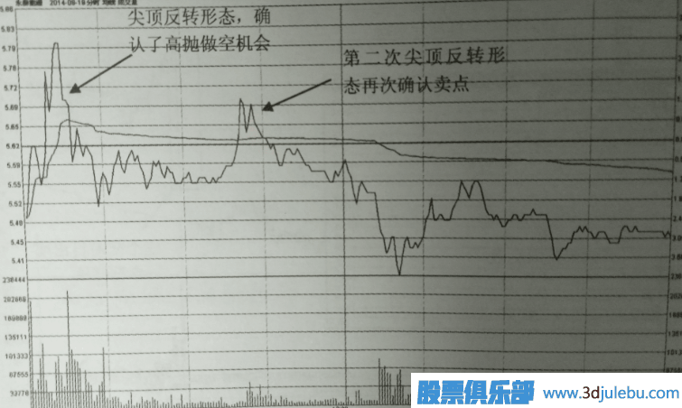 價(jià)格在分時(shí)圖中確認(rèn)是尖頂?shù)牡湫头崔D(zhuǎn)形態(tài)的時(shí)候,是高拋?zhàn)隹盏男盘?。這個(gè)時(shí)候,如果成交量達(dá)到天量,并且即將成為日K線圖中的典型頂部形態(tài),那么我們在分時(shí)圖中做空交易是沒有問題的。隨著天量頂部反轉(zhuǎn)形態(tài)的出現(xiàn),價(jià)格下跌空間將非常大,這里高拋的機(jī)會(huì)成為最佳的做空信號。