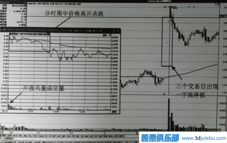 要點(diǎn)2:結(jié)合日K線圖中股價(jià)連續(xù)三日出現(xiàn)跳空上漲的一字漲停走勢,我們可以斷定,分時(shí)圖中天量高開后回落情況已經(jīng)構(gòu)成反轉(zhuǎn)形態(tài)。即便還未到收盤,我們提前一步做空,都可以降低虧損。